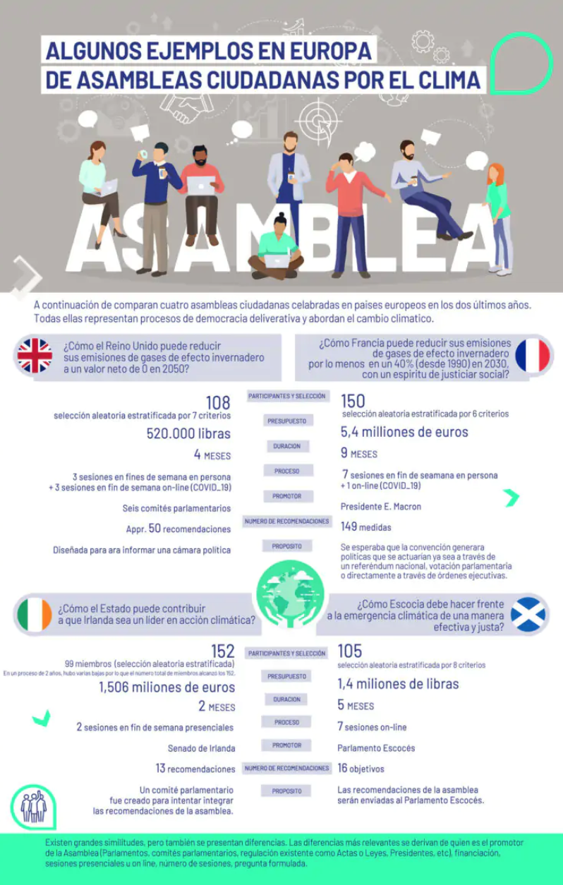La emergencia climática es el desafío más decisivo de nuestro tiempo. Las agendas políticas de todos los países están renovándose para evitar un calentamiento global peligroso por encima de los 2 grados centígrados y un cambio climático catastrófico. Las medidas de transición ecológica y energética tienen un gran impacto en la ciudadanía, en su alimentación y en sus formas de desplazarse, de producir, de trabajar y de consumir, y en sus relaciones con la naturaleza. Implican reformas que no se pueden llevar a cabo sin su aceptación, colaboración e implicación. Tampoco sin su participación. Por eso son tan importantes las consultas públicas, que los mecanismos y organismos de participación ya existentes aborden de manera persistente y dinámica las decisiones sobre cambio climático y que las medidas de transición se adopten y desarrollen con diálogo social para que sean justas. Pero una materia tan decisiva como la emergencia climática, también requiere activar la participación con iniciativas adicionales e innovadoras. Eso explica el reciente y todavía incipiente surgimiento de nuevos procesos deliberativos de la ciudadanía para ofrecer su visión y sus propuestas frente al cambio climático. Algunos países como Reino Unido, Francia, Irlanda y Escocia han realizado Asambleas Ciudadanas —constituidas por ciudadanas y ciudadanos representativos de la ciudadanía— en torno a cómo hacer frente a la emergencia climática (ver figura 1).
