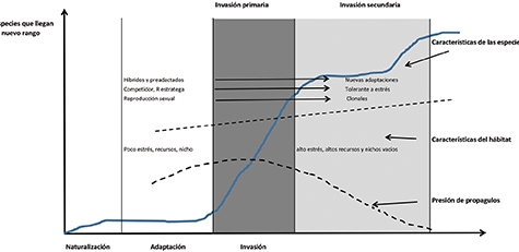 Pero estos modelos se centran únicamente en el análisis de los patrones y procesos que preceden a la invasión, como la introducción, naturalización y fase de reposo. Estos mismos autores argumentan qué cambios importantes ocurren en los procesos conductores de las invasiones también después de estas etapas iniciales, introduciendo por tanto una nueva distinción entre fases primarias y secundarias de la invasión. Reconocen tres conjuntos de factores que influyen en el proceso de invasión: rasgos de las especies, características del hábitat y presión de propágulos, y qué puede cambiar según las diferentes fases determinando la evolución del mismo. En cualquier caso este es un modelo que no se ha evaluado plenamente pero que encaja bien dentro del concepto de estudio establecido y conocido acerca del desarrollo de una invasión. Parte fundamentalmente de dos observaciones; la primera, que las invasiones usualmente comienzan con la colonización de hábitats perturbados, climáticamente favorables (o compatibles), usualmente asociados a la actividad humana, y la segunda, que las poblaciones de muchas especies invasoras poseen o adquieren el potencial genético para expandirse en los hábitats menos perturbados, naturales o seminaturales, y/o climáticamente más estresantes donde rasgos ecológicos diferentes son requeridos. Por tanto, la colonización de los hábitats de la segunda fase (naturales o seminaturales) solo es posible si una especie puede extender su rango ecológico, en términos de las condiciones abióticas que puede tolerar o de los tipos de vegetación que puede colonizar (Figura 1).
