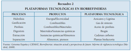 En función del producto obtenido y de los procesos de conversión utilizados, es preciso aplicar diversos sistemas de aprovechamiento, que a su vez configuran diferentes plataformas tecnológicas. El National Revewable Energy Laboratory (USA) ha definido seis plataformas tecnológicas esenciales para la obtención de bioproductos a partir de fuentes de biomasa (recuadro 2).